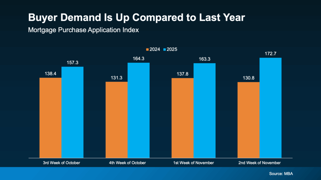 And it’s not just sellers making moves. With more options and slightly better affordability, buyers are getting back in the game, too. The Mortgage Bankers Association (MBA) reports purchase applications are up compared to last year, a clear signal that demand is building again (see graph below):