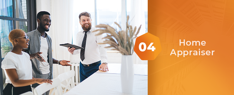 Make sure you don’t confuse the home appraiser with the home inspector. The home appraiser determines the value of the property for sale through an unbiased and professional evaluation called the home appraisal, which is required by lenders before issuing a mortgage. An appraiser will consider factors such as the size of the home, exterior and interior conditions, and will compare it to similar home sales in the neighborhood before determining the home’s value.
